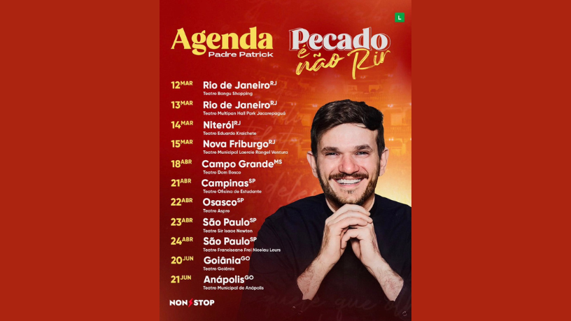 Fenômeno nas redes sociais e também nos palcos, Padre Patrick chega com uma nova turnê e um convite provocador: rir, refletir e se reconhecer. O espetáculo “Pecado É Não Rir” vai além da comédia tradicional ao unir humor sagaz, crítica bem-humorada e mensagens profundas que dialogam diretamente com a fé e o cotidiano.No palco, Padre Patrick conduz a narrativa de forma leve e envolvente, trazendo à tona dúvidas inusitadas e situações divertidas que revelam um a um os sete pecados capitais: soberba, avareza, luxúria, inveja, gula, ira e preguiça. Cada pecado serve como ponto de partida para histórias cotidianas, personagens caricatos e situações com as quais o público facilmente se identifica.Mas o riso é apenas o começo. Ao final de cada bloco, o espetáculo surpreende ao revelar o lado mais reflexivo do sacerdote, com passagens bíblicas e mensagens sinceras sobre os perigos que se escondem por trás de cada pecado. O contraste entre a comédia e a profundidade espiritual transforma o show em uma experiência que vai além do entretenimento.“Pecado É Não Rir” é comédia, mas também é espelho. Rir dos pecados é fácil; o verdadeiro desafio é reconhecer que eles também habitam em nós.Com direção criativa e uma cenografia que explora iluminação e trilhas sonoras marcantes, o espetáculo conduz o público por uma jornada que começa no riso, passa pela consciência e termina em um convite à transformação.Em março, Padre Patrick leva o espetáculo ao Rio de Janeiro e região, passando por Rio de Janeiro (capital), Niterói e Nova Friburgo, em apresentações que prometem casas cheias e muita conexão com o público.Non Stop apresenta Padre Patrick em uma comédia que questiona o que é pecado — e o que é riso. (CRÉDITOS: RAFAEL STRABELLI)“Pecado É Não Rir” é um show para rir, pensar e, quem sabe, até se confessar. Sem culpa, mas com verdade.